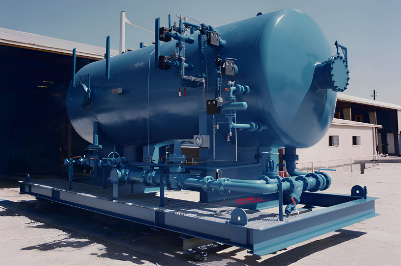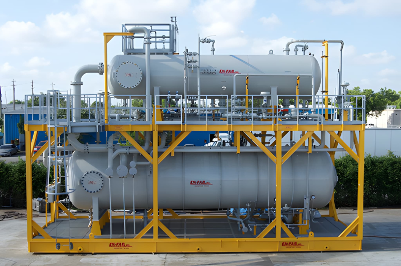 A Free water knock out skid gives the incoming mixture of oil and free water time to separate. The vessel is designed so that all liquid will move at an even rate through the vessel, and not channel (accelerate).